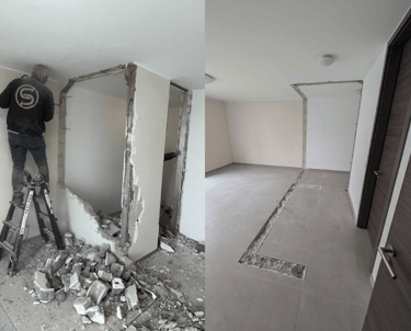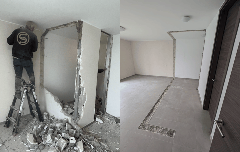 Démolition d’un mur dans un appartement situé à Luxembourg-Kirchberg. Intervention encadrée, protection des lieux et gestion propre du chantier avant la suite des travaux.